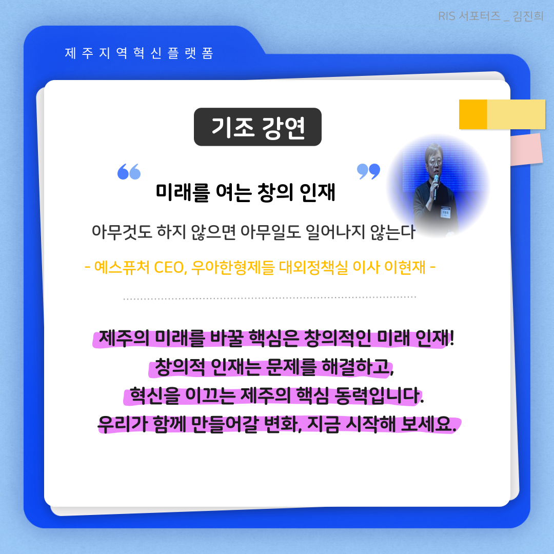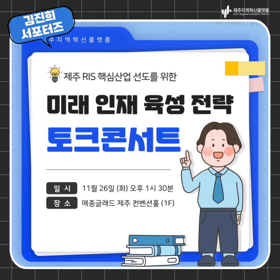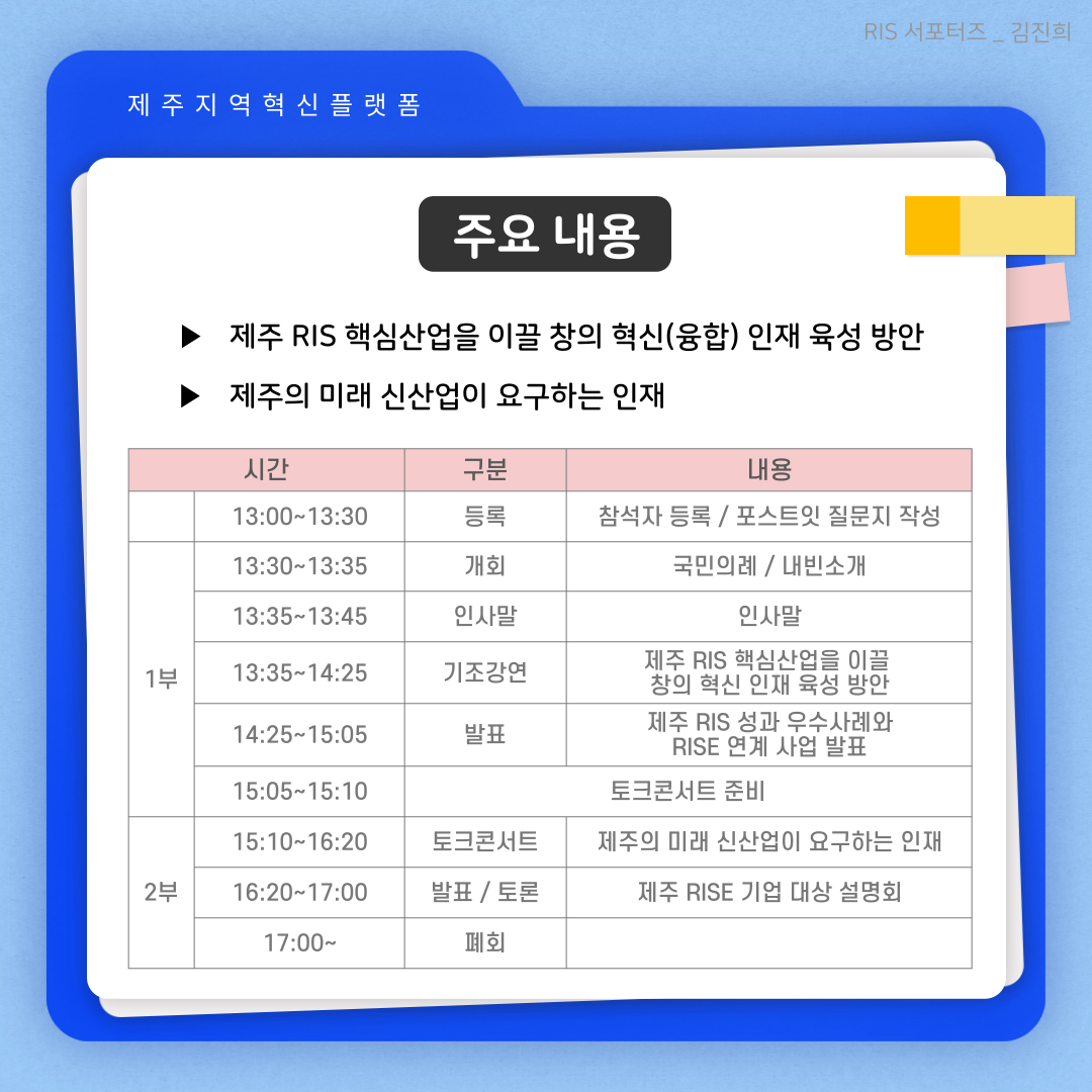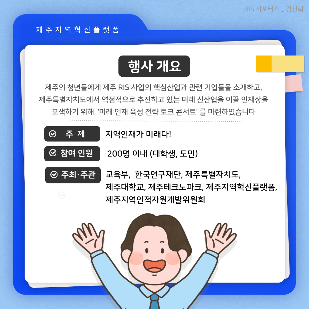 [제주지역혁신플랫폼 서포터즈_김진희]여러분의 많은 관심과 참여 덕분에제주 RIS 핵심산업 선도를 위한 미래 인재 육성 전략 토크콘서트가 무사히 마무리 되었습니다!RIS 핵심산업을 이끌 창의 혁신(융합) 인재 육성 방안을 주제로 한 기조강연과, 제주의 미래 신산업이 요구하는 인재에 대해 함께 이야기해보는 토크콘서트까지!김진희 학생이 직접 제작한 카드뉴스로 한번 확인해 볼까요?