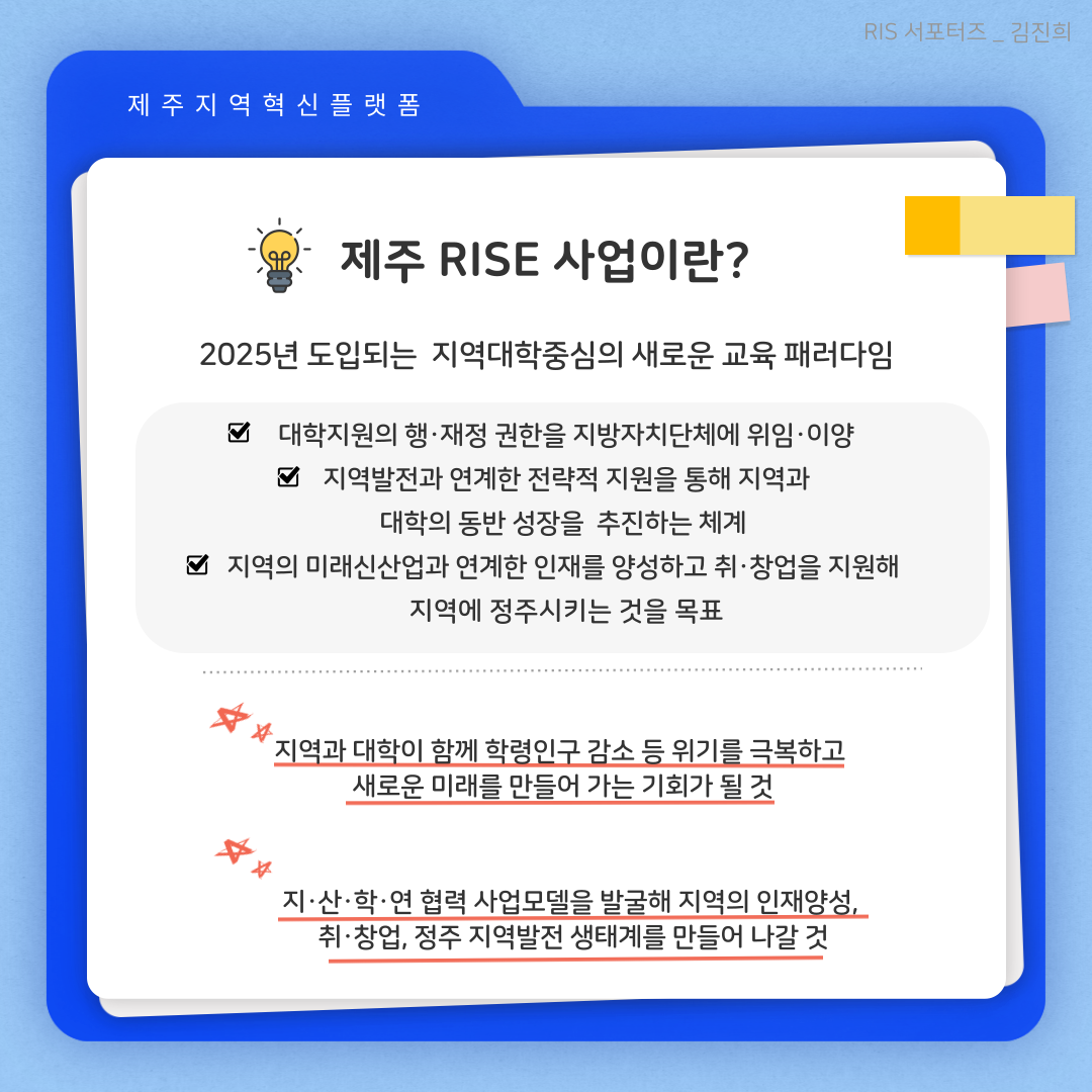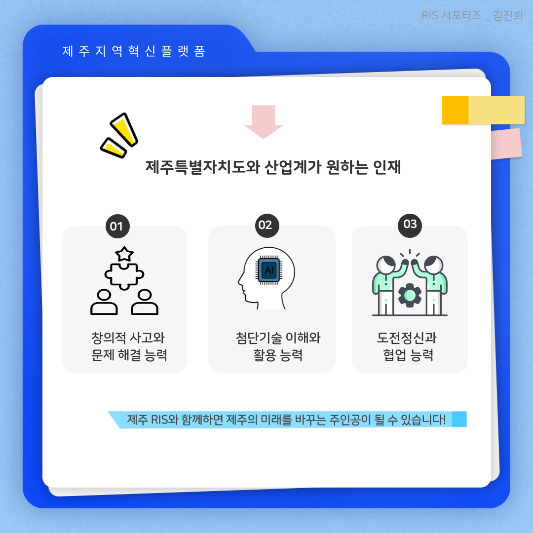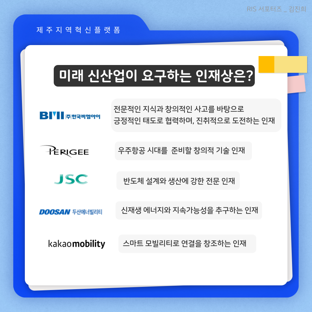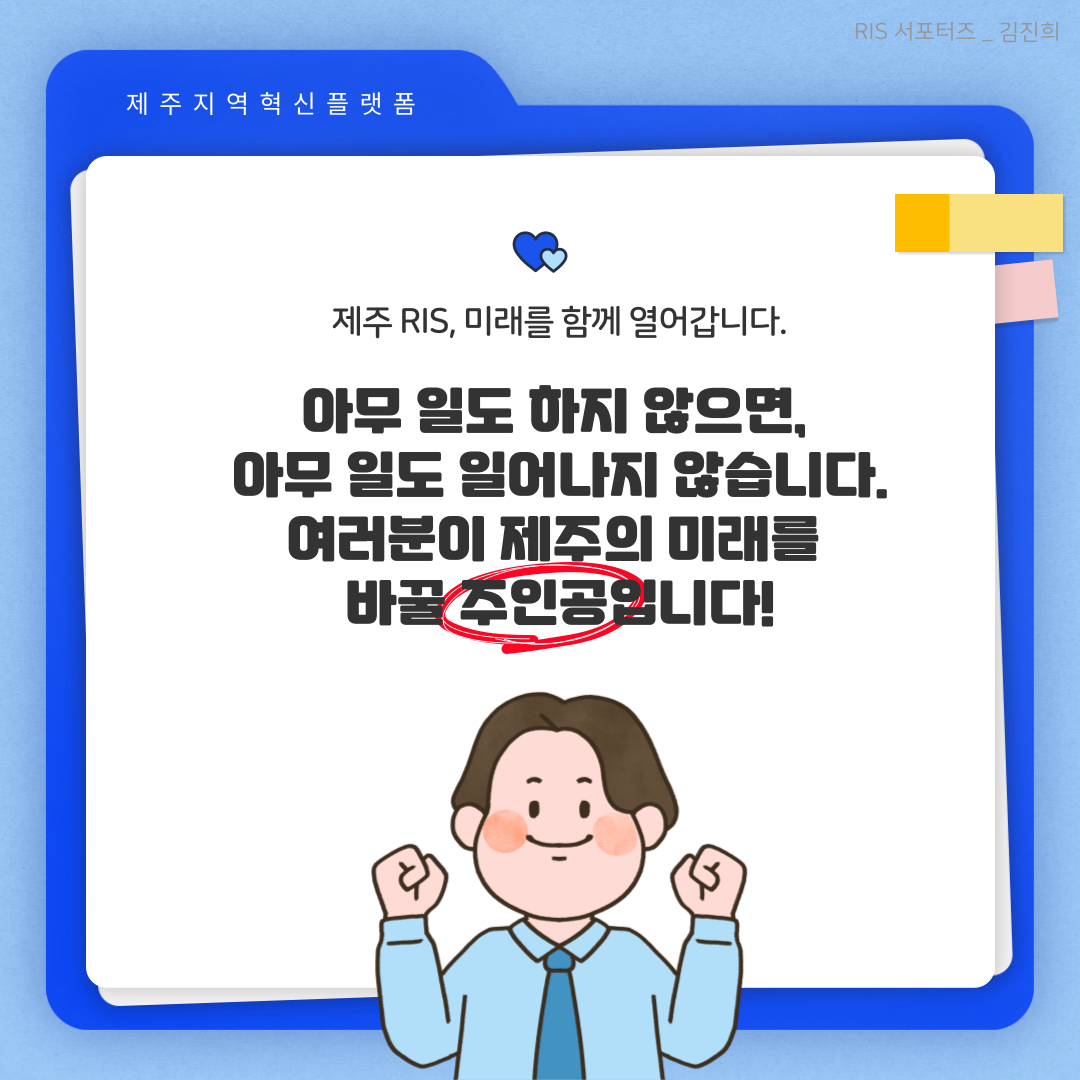 [제주지역혁신플랫폼 서포터즈_김진희]여러분의 많은 관심과 참여 덕분에제주 RIS 핵심산업 선도를 위한 미래 인재 육성 전략 토크콘서트가 무사히 마무리 되었습니다!RIS 핵심산업을 이끌 창의 혁신(융합) 인재 육성 방안을 주제로 한 기조강연과, 제주의 미래 신산업이 요구하는 인재에 대해 함께 이야기해보는 토크콘서트까지!김진희 학생이 직접 제작한 카드뉴스로 한번 확인해 볼까요?